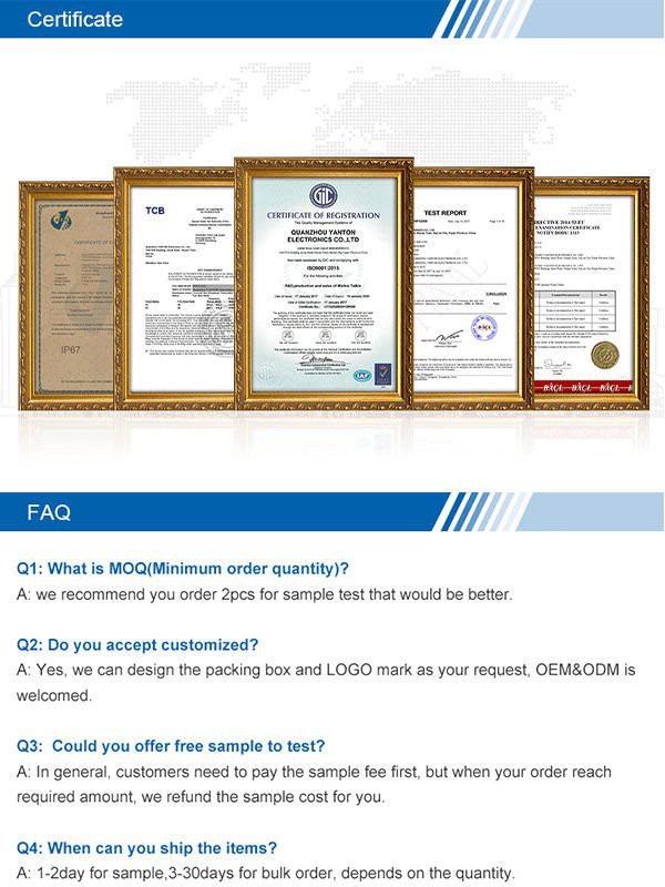 Η πολιτική μας εγγύησης είναι 12 μήνες για το Radio Body και 6 μήνες για την μπαταρία. Όσον αφορά την εξυπηρέτηση μετά την πώληση, θα παρέχουμε 1-σε-1 επαγγελματίες υπηρεσίες μεταπωλήσεων, ώστε να μπορείτε να έχετε ξέγνοιαστη μετά την πώληση.